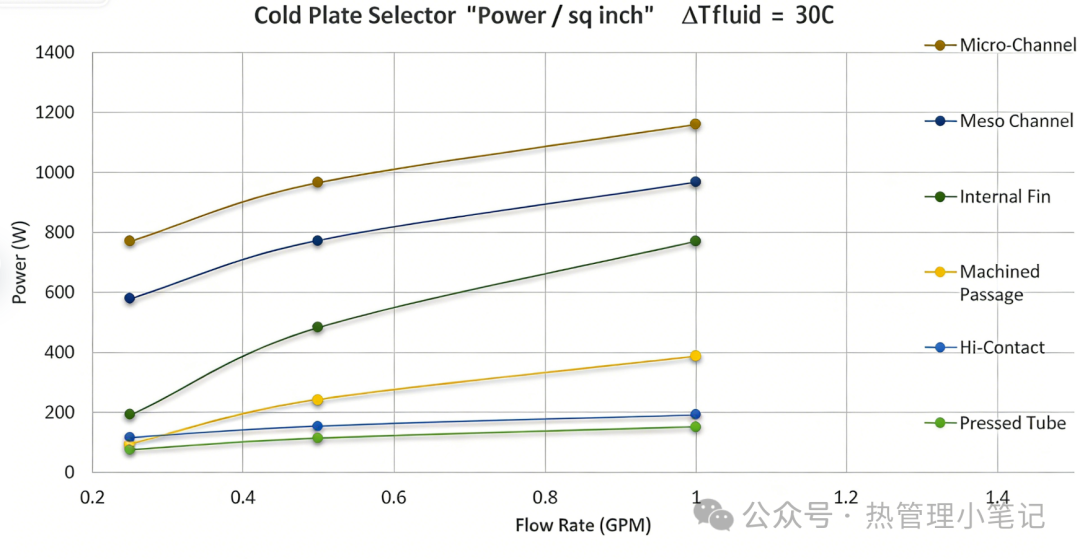 Key insight: Higher flow is not always better. Excessive flow increases system pumping power and energy consumption. Therefore, selection must balance heat dissipation requirements and system energy consumption to find an optimal trade-off between thermal performance and pumping cost. For example, micro-channels show obvious advantages at high flow rates but consume much more pumping power than other structures, making them suitable only for applications demanding extremely high heat dissipation efficiency with low sensitivity to energy use.