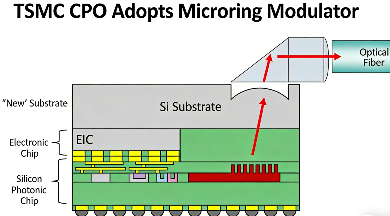This diagram illustrates the core structure of TSMC’s Co-Packaged Optics (CPO) technology, which integrates an electronic chip and a silicon photonic chip into a single package, using a microring modulator to convert electrical signals into optical signals at high speed.