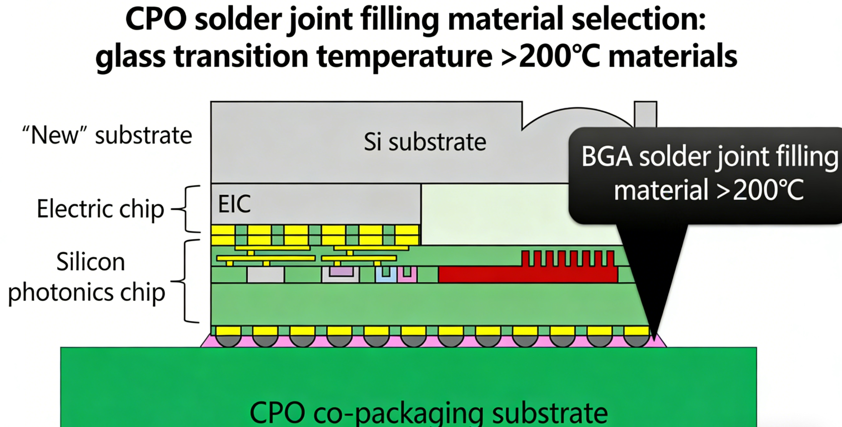 This diagram illustrates the core structure of CPO (Co-Packaged Optics), with a key design requirement that the glass transition temperature (Tg) of the BGA solder joint underfill material must be >200°C. This requirement directly supports the core goal of CPO thermal management. From the cross-sectional view, the CPO consists of a Si substrate, electrical chip (EIC), silicon photonic chip, and co-packaging substrate, with each layer connected electrically and mechanically via BGA solder joints. Due to its high integration and power density, the heat flux of CPO is far higher than that of traditional packaging, leading to sustained high-temperature environments during operation and manufacturing, which imposes stringent challenges on thermal reliability. The selection of underfill materials with Tg >200°C is precisely to meet this thermal management need. Such materials maintain structural rigidity at high temperatures, mitigating stress caused by thermal expansion mismatch between different materials, and preventing solder joint deformation and fatigue failure due to thermal cycling. This supports long-term stable operation in high-speed optical communication scenarios and is a critical component for ensuring thermomechanical reliability in the CPO thermal management system.